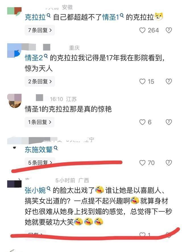 东施效颦成语在百度百科解释为模仿别人反而出丑,可作自谦词。媒体描述其道理为不要盲目模仿,根据自身特点扬长避短。网友应用此成语时,指向张小婉挑战克拉拉红裙的举动,认为忽略自身独特,导致适得其反。情圣3上映后,短视频平台继续传播相关内容,克拉拉的原版片段被重温。